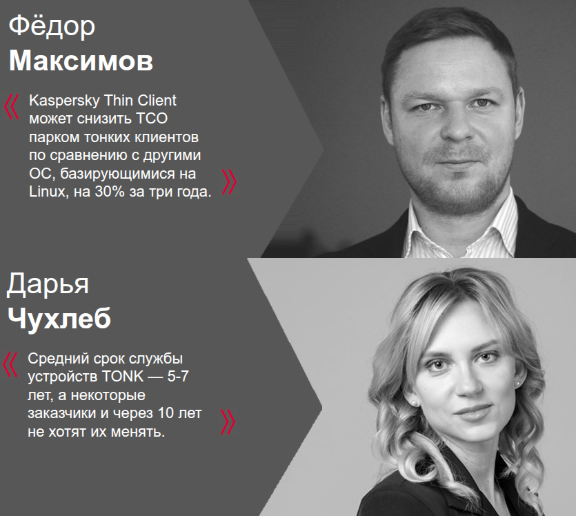 Тонкие клиенты становятся ключевым элементом корпоративной инфраструктуры, работая без сбоев по 10 лет, кратно снижая эксплуатационные расходы и гарантируя информационную безопасность. О том, какие факторы двигают рынок, зачем предприятиям переходить на тонкие клиенты именно сейчас и как на практике выглядит эффект от внедрения оборудования TONK и микроядерной KasperskyOS, TAdviser поговорил с Дарьей Чухлеб, руководителем департамента корпоративных продаж ТОНК, и Фёдором Максимовым, старшим менеджером по развитию бизнеса Лаборатории Касперского.